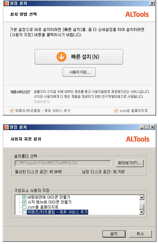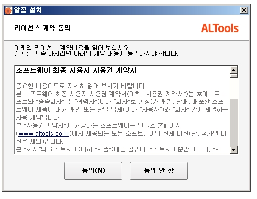 소프트웨어 최종 사용자 사용권 라이센스는 중요한 항목이니 꼭 읽어보고 사용상에 문제가 없는지 확인해줍니다. 동의 버튼을 누르면 진행이 됩니다. 다음 단계에서는 설치 시작 버튼을 클릭하고 진행해 줍니다. 설치 방법은 매우 간단합니다. 빠른 설치 버튼만 누르면 완료됩니다. 단, 하단에 제휴서비스라는 항목은 필요한 분만 체크후 '빠른 설치'를 진행해 주면 됩니다.