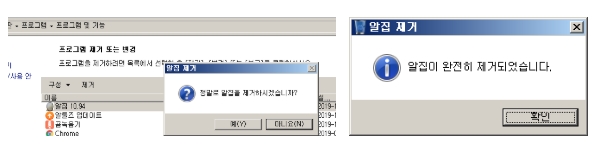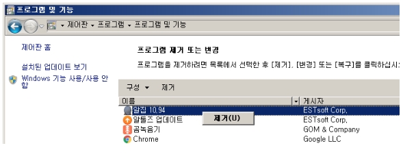 제어판이라는 것을 찾습니다. 제어판에서 프로그램 제거를 선택하면 창이 하나 열립니다. 일단 설치 설치된 프로그램 들 중에서 우리가 찾는 알집을 찾아 봅니다.