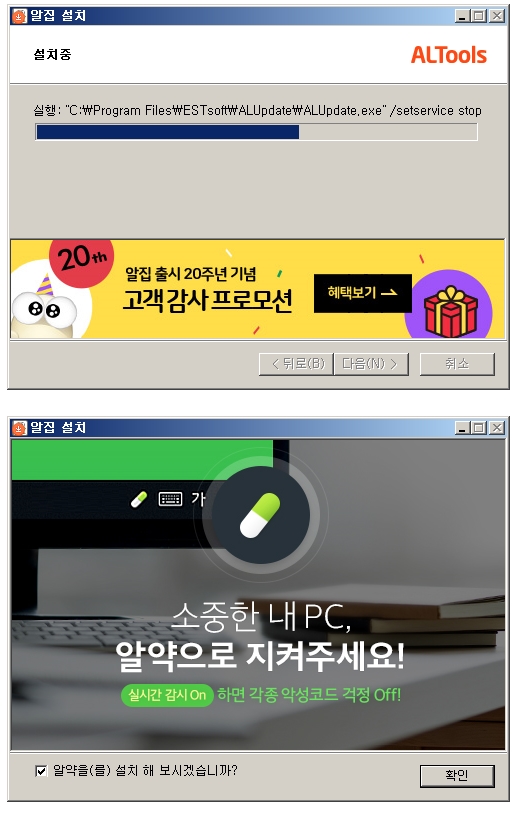 마지막에 설치가 완료되면 화면에는 완료창이 아니라 다른 창이 하나 표시됩니다. 내용을 확인해 보면 알겠지만 추가적인 알약이라는 프로그램을 추천하는 내용입니다.