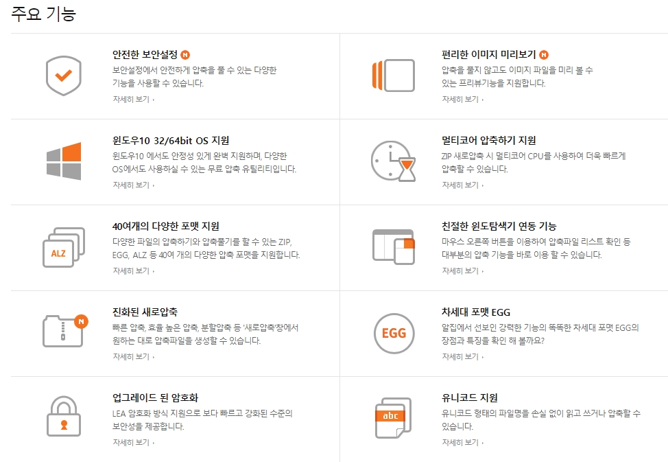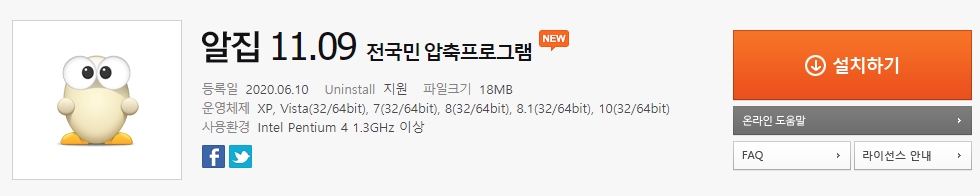 앞서 언급했던 것처럼 윈도우 10버전 32비트/64비트에서도 사용할 수 있는 제품이 알집 입니다. 멀티코어를 사용하여 빠르게 압축할 수 있고 다양한 압축 포맷(확장자)을 지원해주기도 합니다.