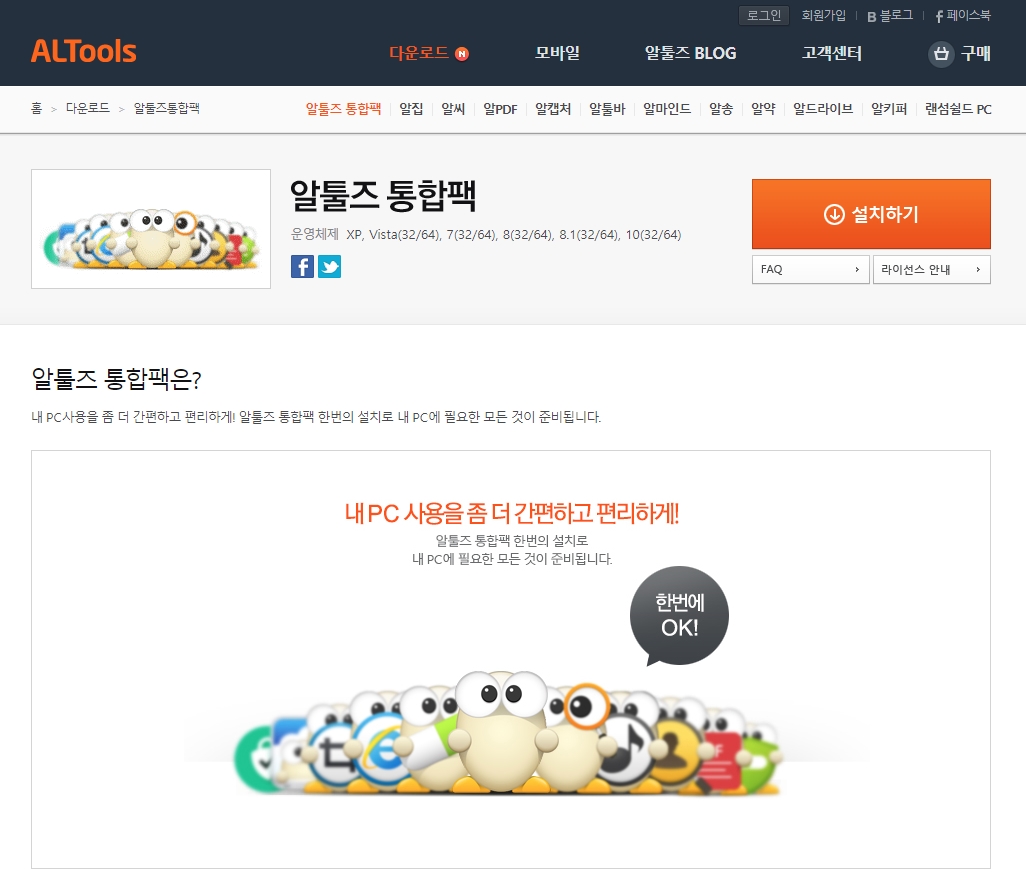 알툴즈 공식 홈페이지-> 다운로드 메뉴-> 알집 순차적으로 선택해주면 정상적으로 알집 무료 다운로드가 가능한 페이지에 접속할 수 있습니다. 알집은 제품페이지 화면 중앙 오른쪽에 살펴보면 설치하기를 찾을 수 있습니다. 이 버튼이 우리가 찾는 알집 무료 다운로드 버튼입니다. 알집 설치파일 용량은 작고 업데이트도 자주 됩니다.