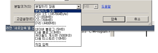 경우에 따라서는 특정 용량으로 압축을 나누어야 하는 경우가 있는데요. 그럴 때는 분할크기라는 항목을 찾아서 진행하면 됩니다. 네이버, 다음 블로그에 올릴 용량으로도 나눌 수가 있습니다. 압축 버튼을 누르면 과정이 진행이 되고 결과가 성공/실패로 표시가 됩니다. 그 화면에 메일에 첨부하거나 복사하기 등이 나옵니다.