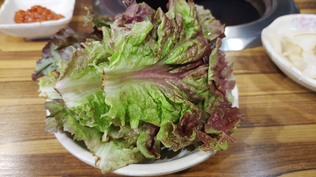 와이프랑 아들을 데리고 가면 양념돼지갈비 3인분과 공기밥 2인분을 주문하는 편입니다. 상추와 쌈무, 백김치가 나왔습니다.