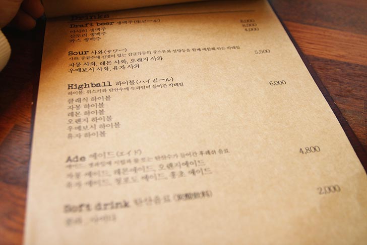 생맥주, 사와, 하이볼 그리고 에이드와 탄산음료가 있습니다. 여기서 카스 생맥주 한 잔과 콜라 하나 주문했습니다.