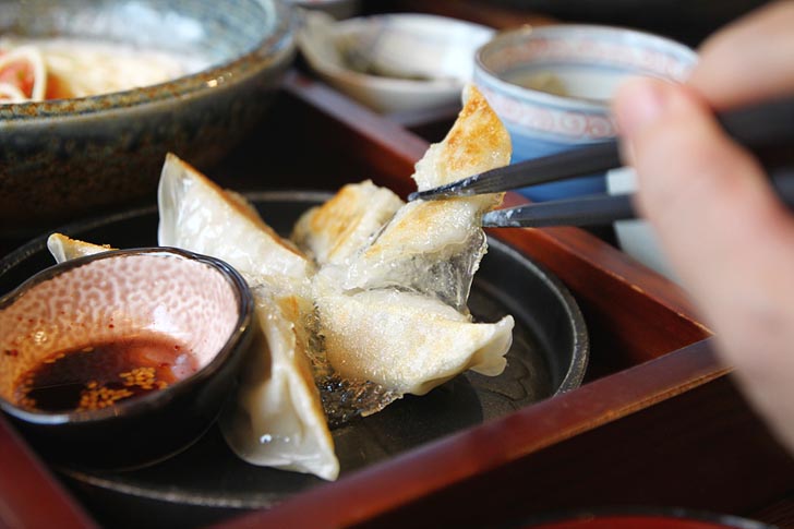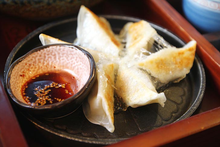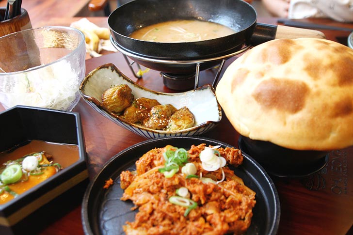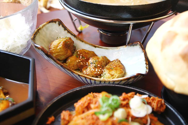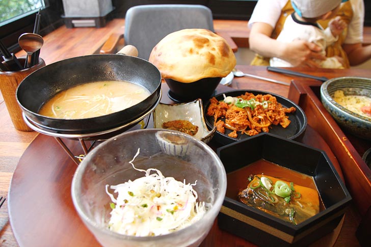 명란이 위에 살짝 얹어진 크림소바, 호일에 쌓여진 궁금증을 자아내는 연어 스테이크, 소스가 많이 뿌려져서 촉촉한 맛이 일품인 나베돈까스, 한입에 쏙 들어가는 야끼교자 군만두 그리고 4가지 반찬이 나왔습니다. 이게 2인분입니다. 다이어트는 흐린 기억 속으로 사라집니다. 정말 푸짐합니다. 대박입니다.