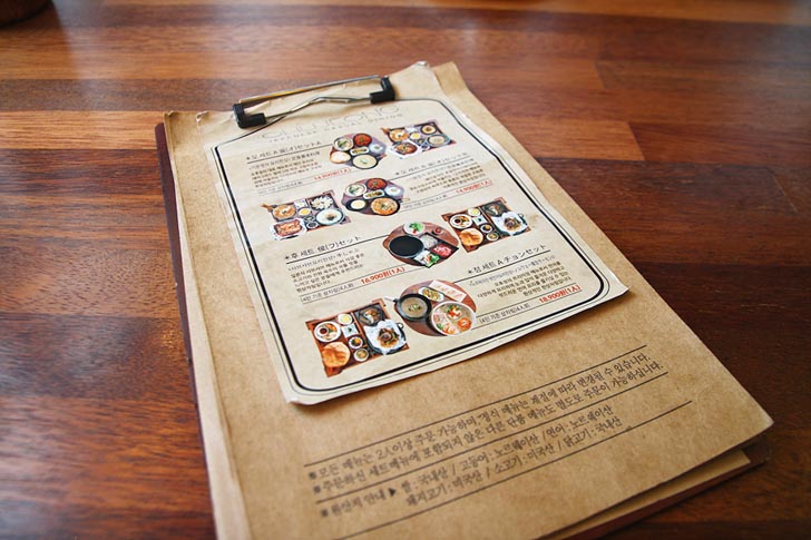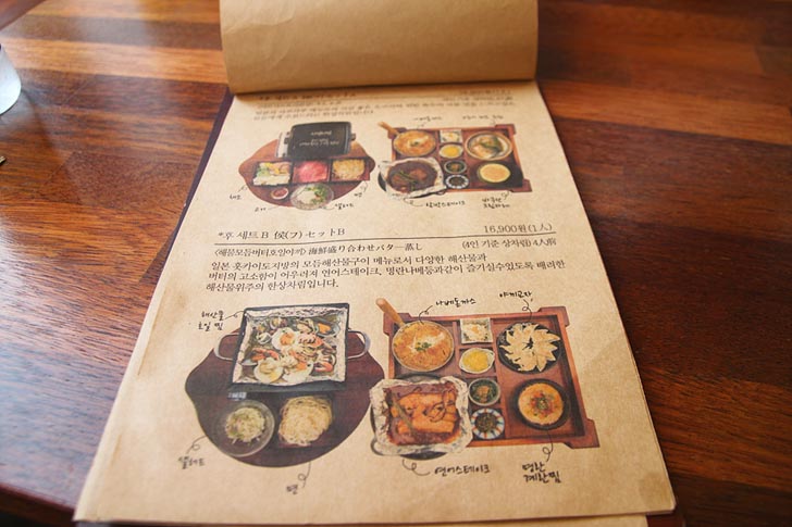 창가쪽에 자리를 잡고 명동거리를 바라보며 오랜만에 여유로운 시간을 가졌습니다. 먼저 메뉴판을 보시겠습니다. 일본스럽게 오래된 종이에 인쇄한 메뉴가 인상적입니다. 쌀은 국내산이고 고등어는 노르웨이산, 연어도 노르웨이산, 돼지고기와 소고기는 미국산이고, 닭고기는 국내산입니다. 다국적 재료인데 맛은 정확히 일본식입니다.
