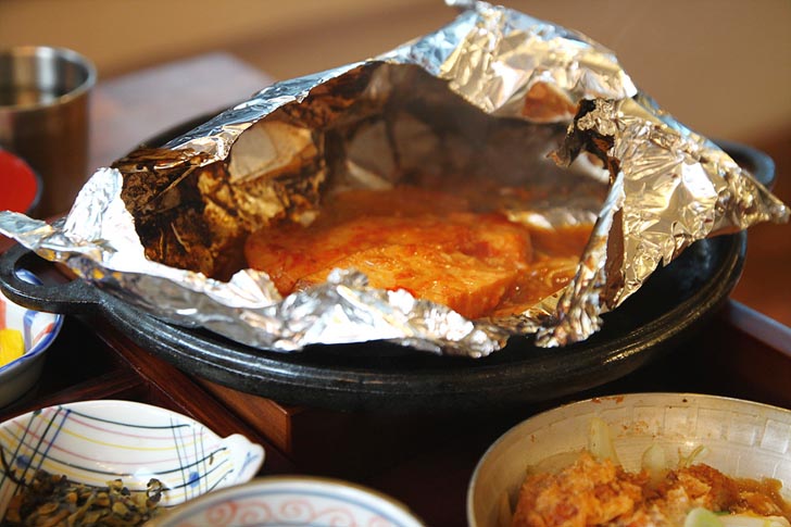 호일을 벗기고 연어 스테이크를 사진에 담아 보았습니다. 매콤한 맛이 일품인 연어찜이 되겠습니다. 공기밥에 밥들이 금세 없어집니다. 밥도둑 전과 10범이 되겠습니다.