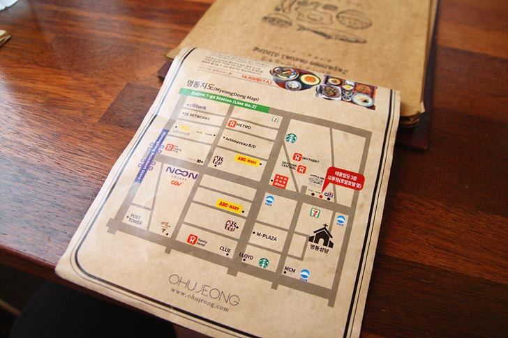 칼라로 인쇄된 종이 뒷면에 명동 지도가 나와 있습니다 명동대성당 가기 전에 호텔 가기 전에 있습니다. 예전에 불고기브라더스가 있었던 곳 같은데 지금은 불고기브라더스가 없어지고 쿠우쿠우와 오후정이 있습니다. 쿠우쿠우 뷔페는 2년 전에 가보았던 곳으로 여기도 매우 맛있습니다.