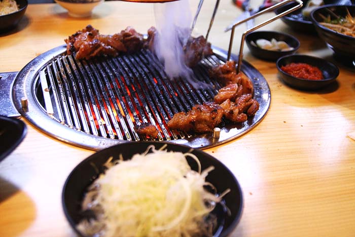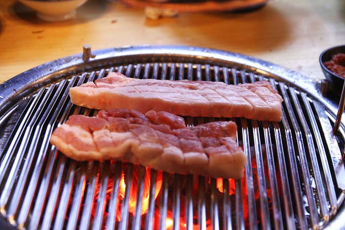 와우..양념돼지갈비 스테이크가 화력이 센 숯불에 지글지글 잘도 구워집니다. 불판을 새것으로 교체해주셨어요...