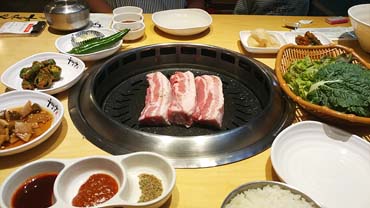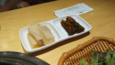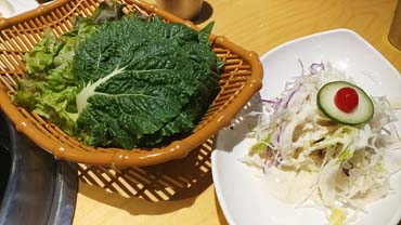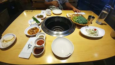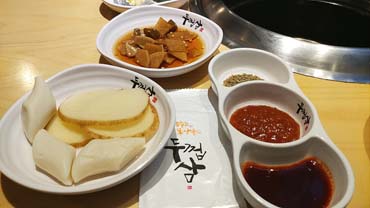주문하니 바로 세팅이 이뤄집니다..밑반찬도 깔끔해요.. 샐러드, 쌈야채, 묵은지, 소금, 쌈장, 구이용 떡과 감자... 양파, 마늘, 청양고추 (엄청 매움), 고추 된장무침 등이 나왔어요. 수저와 물티슈 등은 탁자 사이드에 있답니다...