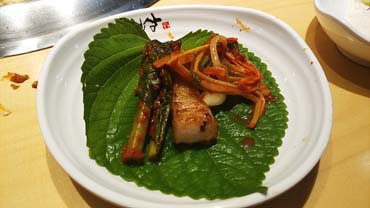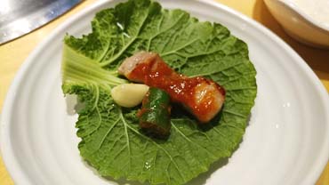 깻잎에 갓김치 올려서... 역삼역맛집 역삼역고깃집으로 좋은 두껍삼 역삼점 고기맛 대박이네요..