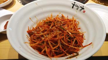 지금까지 삼겹살 먹으면서 이런 비쥬얼은 거의 처음이에요. 알맞은 불판 온도에서 구워져서 그런가봐요..강남스타일로 쌈 싸먹었어요..콩나물무침도 올려서...한입..
