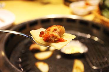 감자와 떡사리.. 불판이 매우 깔끔하고 밑으로 5cm 정도 내려 있어서 기름이 거의 튀지를 않더라구요..이점이 대박이었어요.. 아무리 맛있는 삼겹살을 먹어도 고기가 타거나 고기 기름이 많이 튀면 별로였거든요.