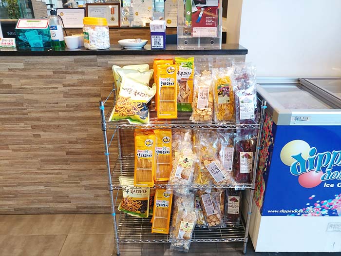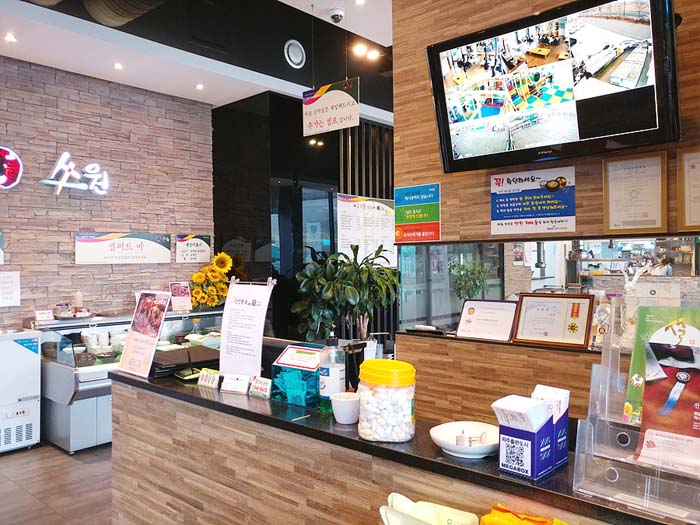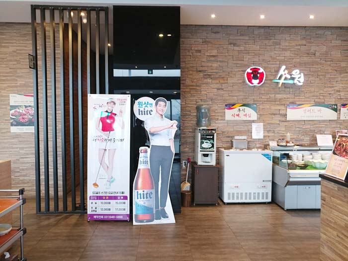 횡성한우 실마리 음식점 안으로 들어왔어요....카운터 옆에 샐러드바도 있네요.. 커피머신도 있고..후식으로 식헤와 매실도 마실 수 있어요..