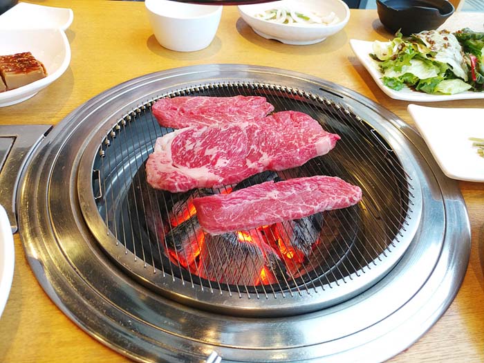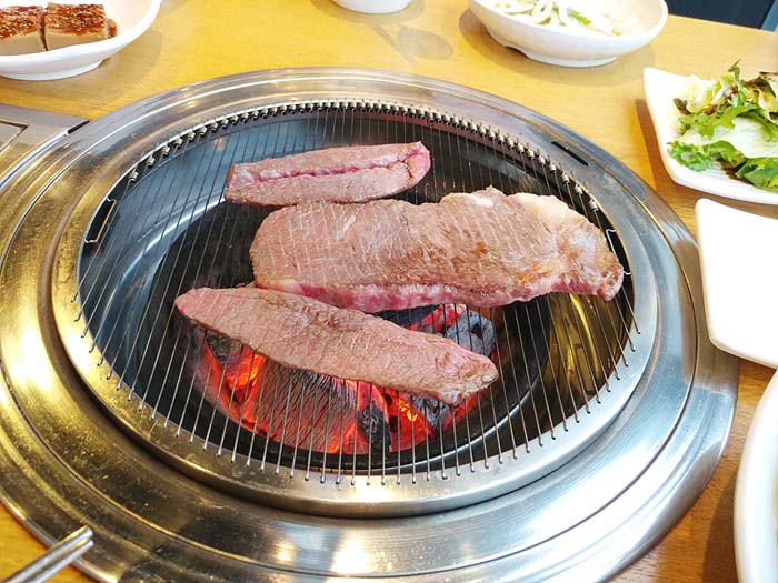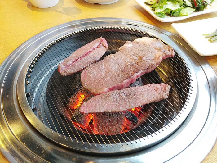 불판도 특이하게 아주 가느다란 불판이에요.....강남이나 남양주 고깃집에 갔을때에는 불판이 황동색에 굵은 불판이었는데요... 여기 횡성한우 실마리에서는 아주 가느다란 불판이라서 고기에 줄이 덜 가서 좋더라구요...