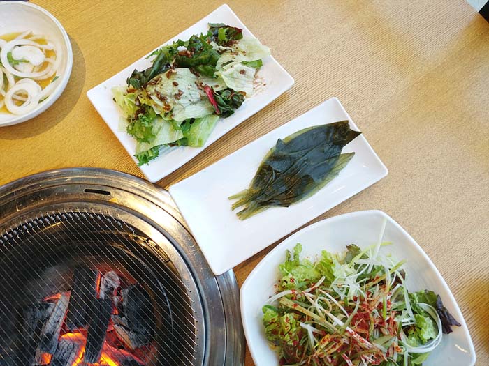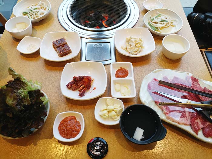 숯과 불판이 세팅되고 밑반찬이 나왔어요...동침, 마늘, 쌈장, 상추, 양념게장, 양파, 도토리묵, 샐러드 등이 나왔어요...그리고 고기를 잘 구울 수 있게 집게와 가위도 준비되었습니다... 한우 고기를 자를때 가위 성능이 좋아야 하는데요....횡성한우 실마리는 가위도 잘 잘려서 좋았어요..