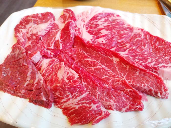 마블링이 선명하게 잘 보이는 한우 고기에요.. 등심, 갈비살, 부채살, 살치살 등이에요. 정육점에서 고기를 구매하신 분들은 상차림비가 따로 없어서 좋았습니다.